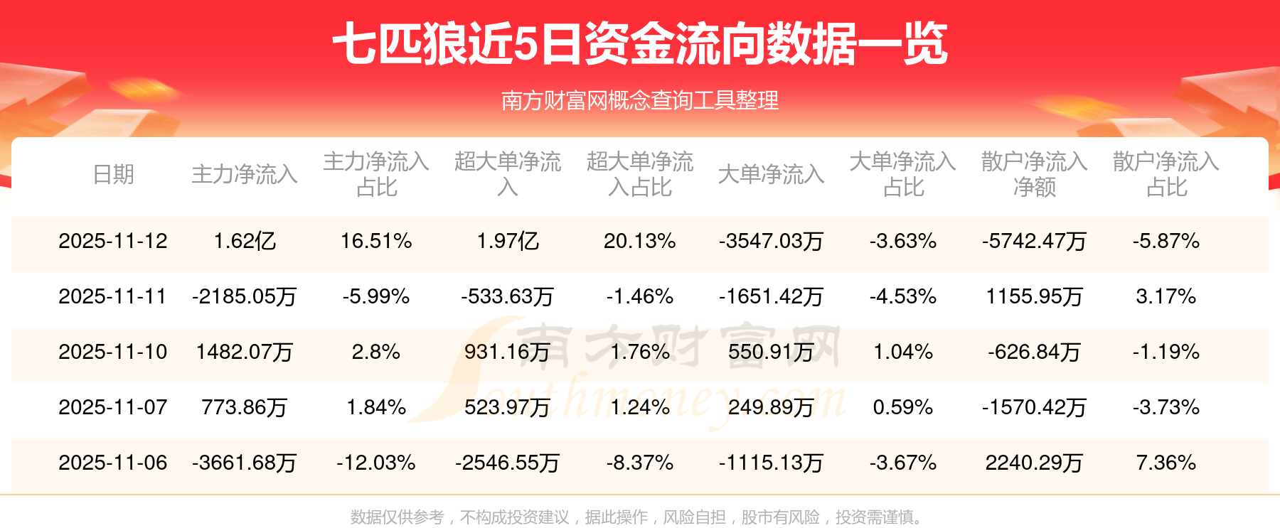 11月12日消息,七匹狼資金凈流入1.62億元,超大單資金凈流入1.97億元,換手率14.47%,成交金額9.78億元。