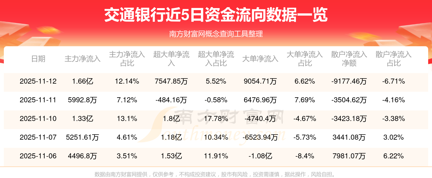 11月12日消息,交通銀行11月12日主力凈流入1.66億元,超大單凈流入7547.85萬元,大單凈流入9054.71萬元,散戶凈流出9177.46萬元。