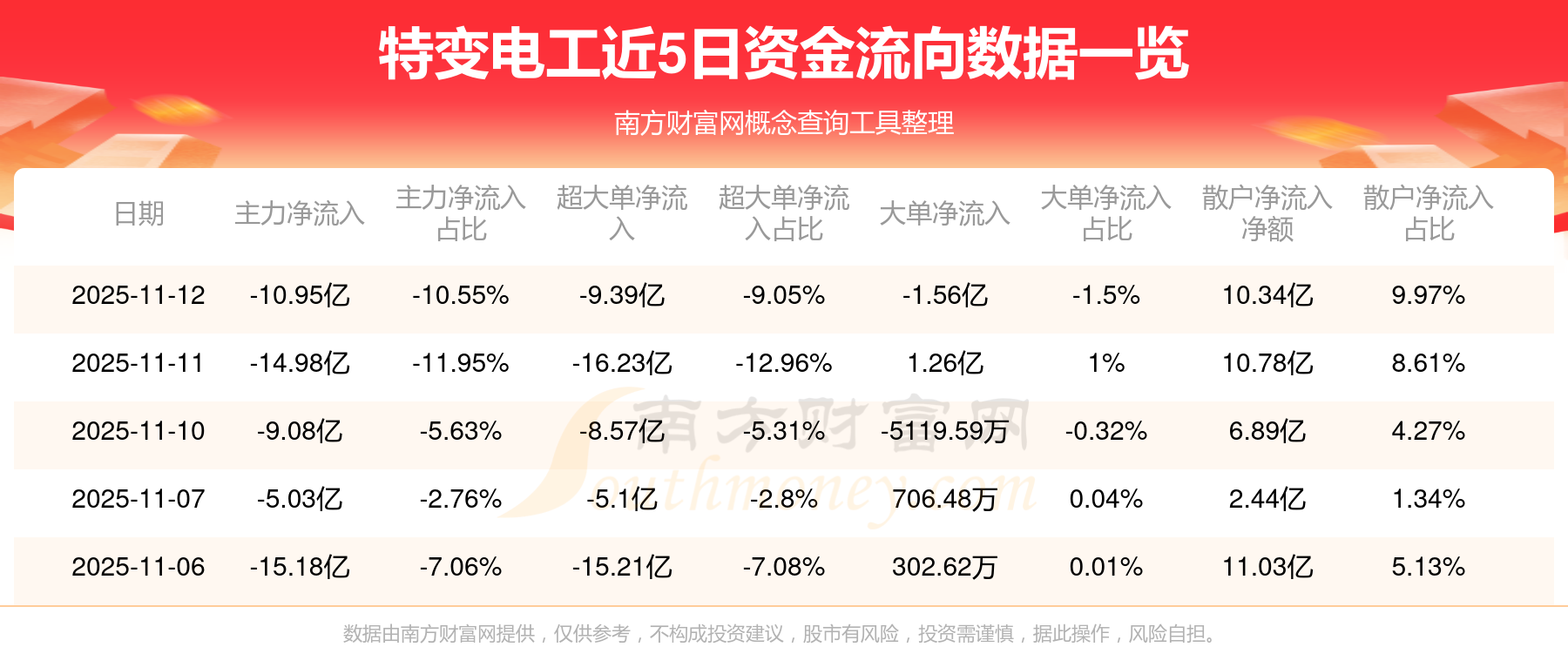 11月12日消息,特變電工資金凈流出10.95億元,超大單資金凈流出9.39億元,換手率4.89%,成交金額61.53億元。
