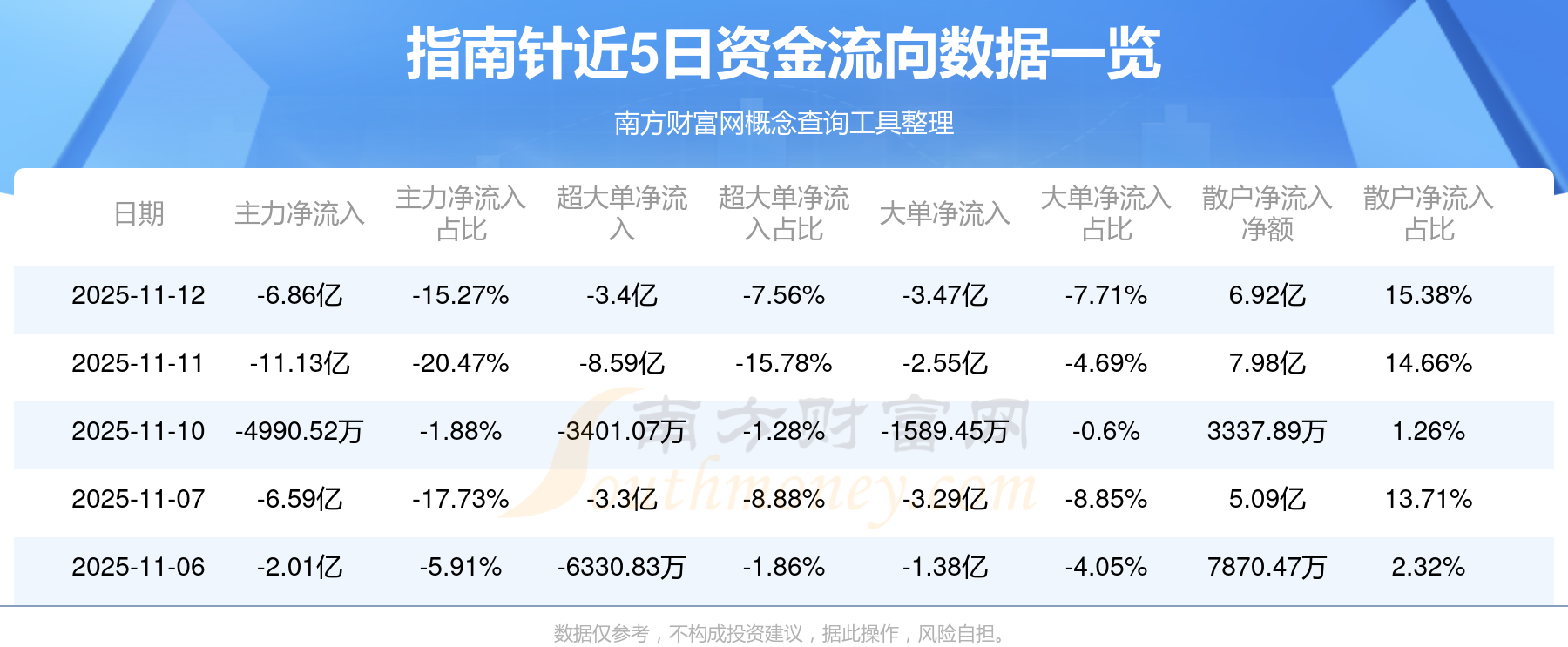 11月12日消息,指南針11月12日主力凈流出6.86億元,超大單凈流出3.4億元,大單凈流出3.47億元,散戶凈流入6.92億元。