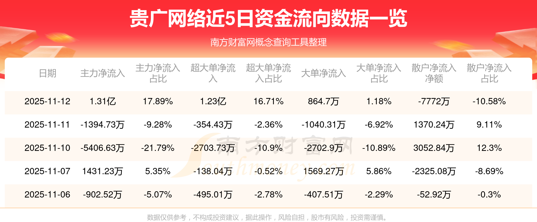 11月12日該股主力凈流入1.31億元,超大單凈流入1.23億元,大單凈流入864.7萬元,中單凈流出5367.67萬元,散戶凈流出7772萬元。