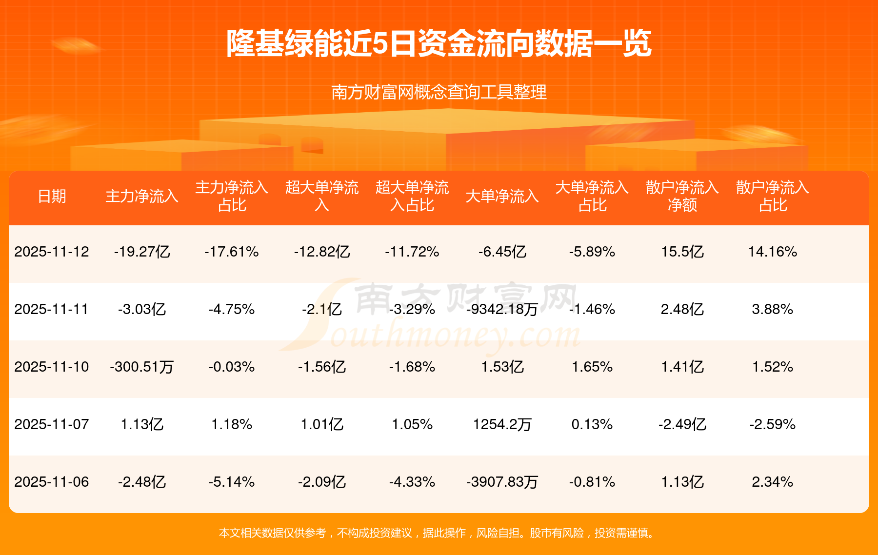 11月12日消息,隆基綠能11月12日主力凈流出19.27億元,超大單凈流出12.82億元,大單凈流出6.45億元,散戶(hù)凈流入15.5億元。