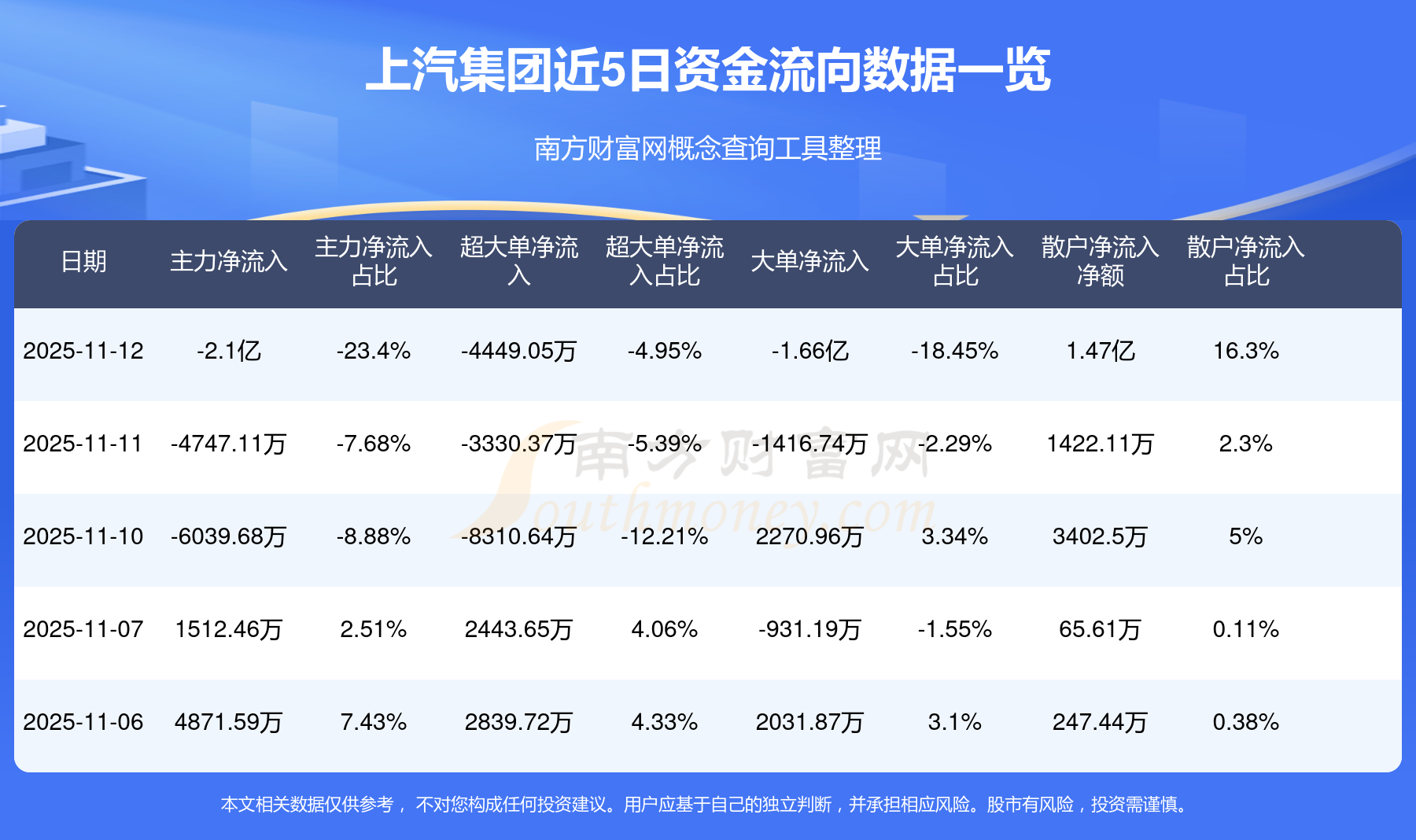11月12日消息,上汽集團11月12日主力凈流出2.1億元,超大單凈流出4449.05萬元,大單凈流出1.66億元,散戶凈流入1.47億元。