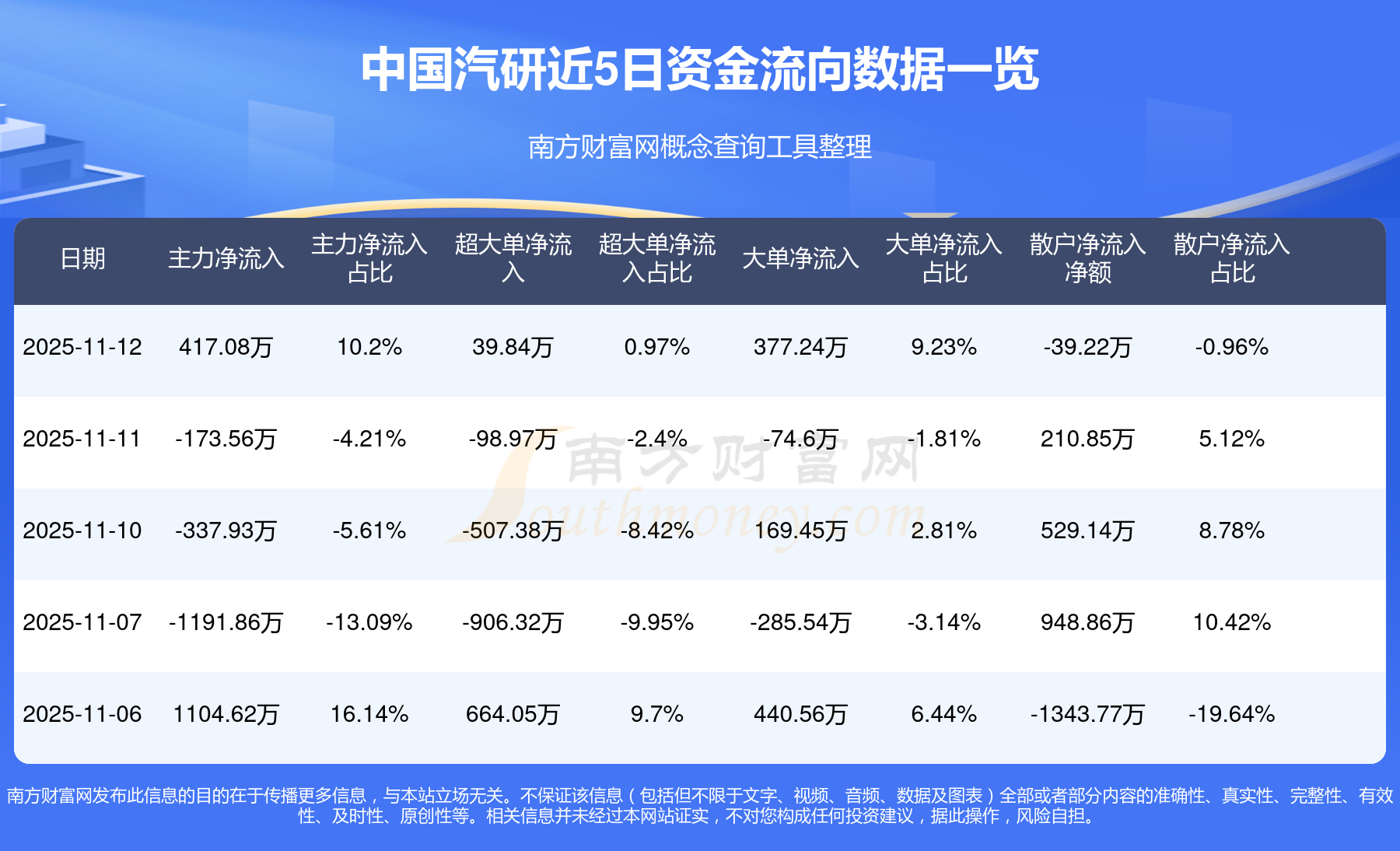 11月12日該股主力凈流入417.08萬(wàn)元,超大單凈流入39.84萬(wàn)元,大單凈流入377.24萬(wàn)元,中單凈流出377.86萬(wàn)元,散戶(hù)凈流出39.22萬(wàn)元。