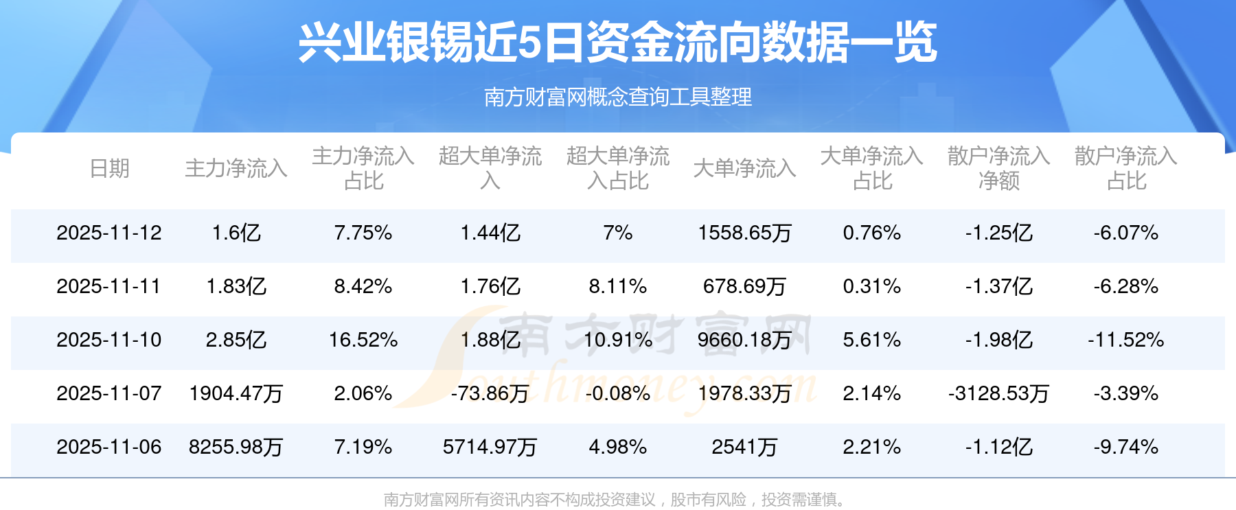 11月12日消息,興業(yè)銀錫主力資金凈流入1.6億元,超大單資金凈流入1.44億元,散戶資金凈流出1.25億元。