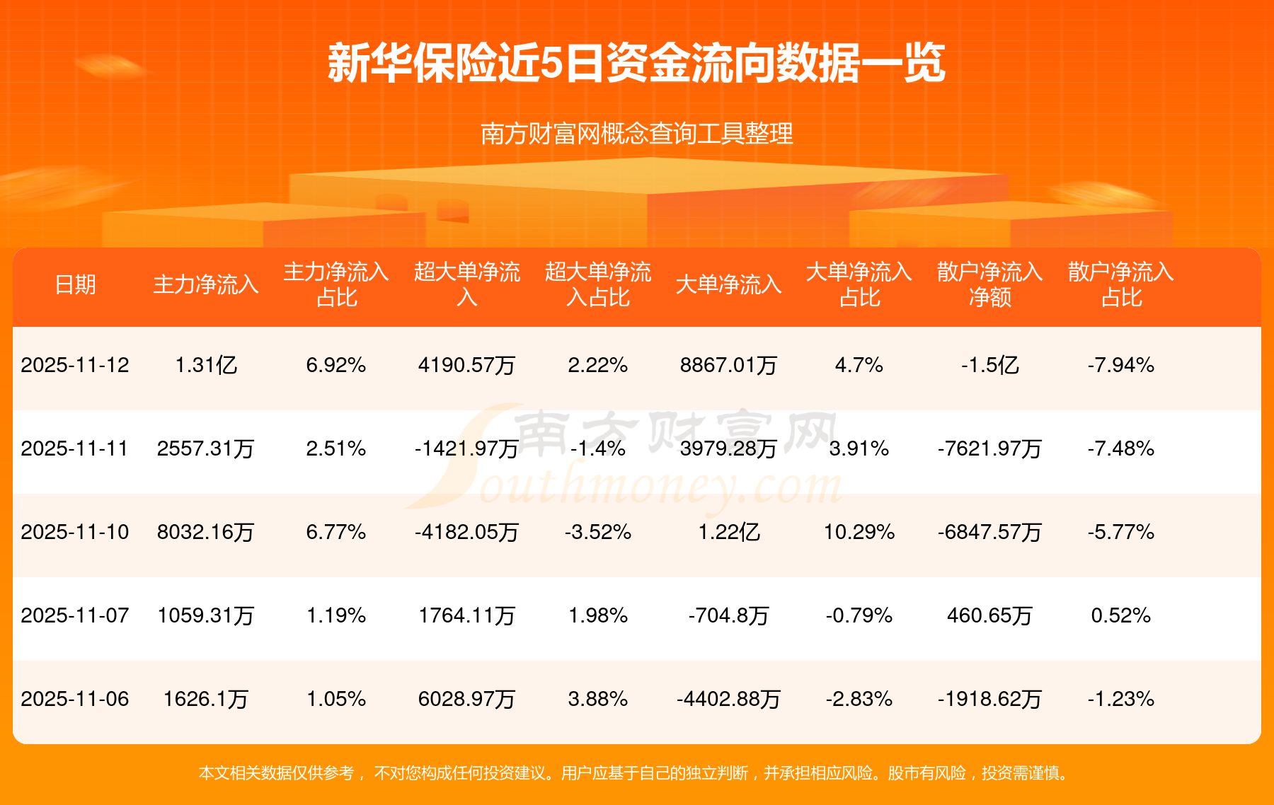 11月12日消息,新華保險(xiǎn)主力凈流入1.31億元,超大單凈流入4190.57萬(wàn)元,散戶(hù)凈流出1.5億元。