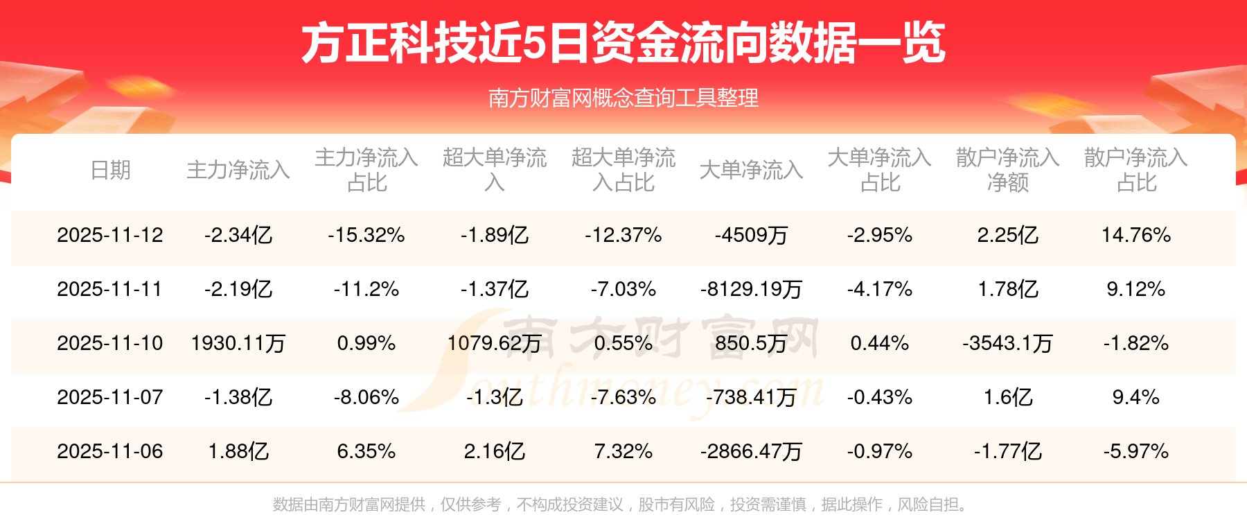 11月12日消息,方正科技11月12日主力資金凈流出2.34億元,超大單資金凈流出1.89億元,大單資金凈流出4509萬元,散戶資金凈流入2.25億元。