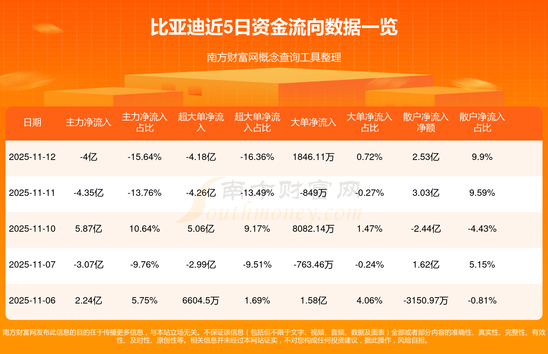 11月12日消息,比亞迪11月12日主力資金凈流出4億元,超大單資金凈流出4.18億元,大單資金凈流入1846.11萬元,散戶資金凈流入2.53億元。