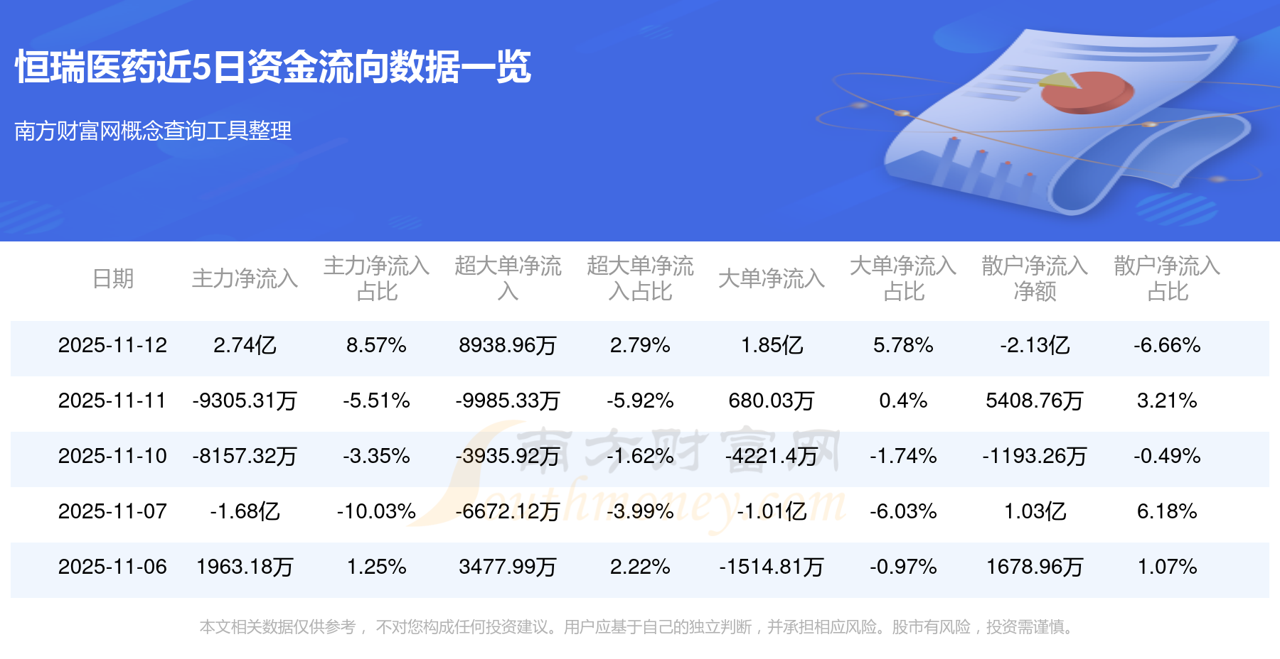 11月12日消息,恒瑞醫(yī)藥11月12日主力凈流入2.74億元,超大單凈流入8938.96萬元,大單凈流入1.85億元,散戶凈流出2.13億元。