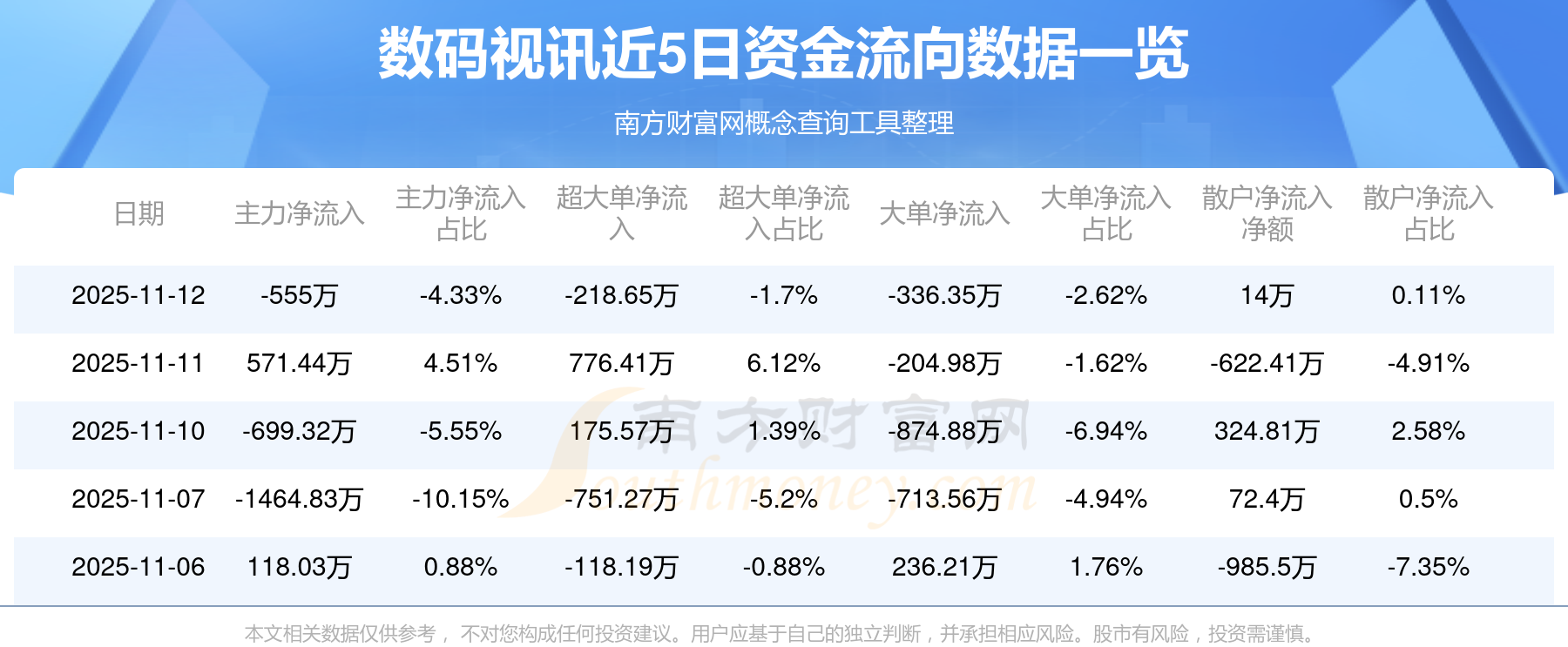 11月12日消息,數(shù)碼視訊資金凈流出555萬元,超大單資金凈流出218.65萬元,換手率0.82%,成交金額5871.93萬元。