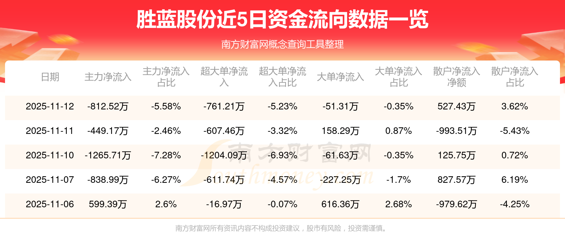 11月12日消息,勝藍股份11月12日主力凈流出812.52萬元,超大單凈流出761.21萬元,大單凈流出51.31萬元,散戶凈流入527.43萬元。