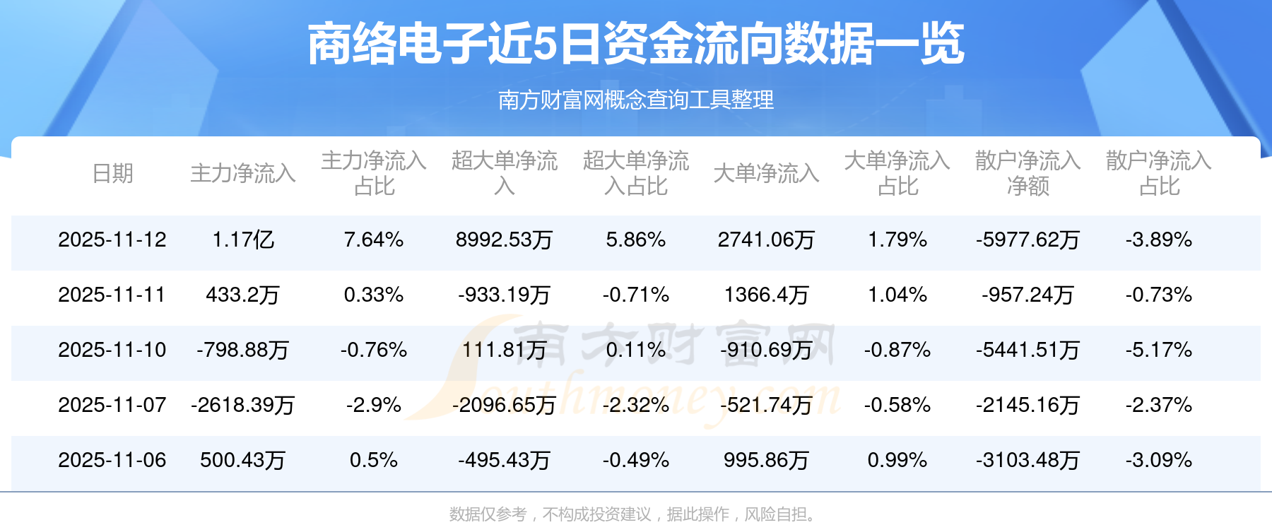 11月12日消息,商絡(luò)電子主力凈流入1.17億元,超大單凈流入8992.53萬元,散戶凈流出5977.62萬元。