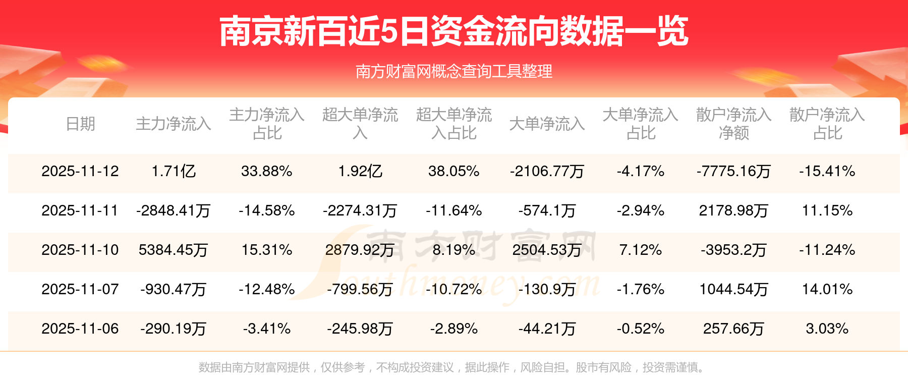 11月12日消息,南京新百11月12日主力凈流入1.71億元,超大單凈流入1.92億元,大單凈流出2106.77萬(wàn)元,散戶凈流出7775.16萬(wàn)元。