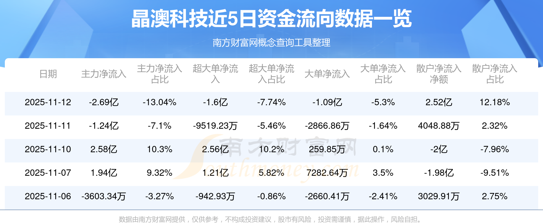 11月12日消息,晶澳科技11月12日主力凈流出2.69億元,超大單凈流出1.6億元,大單凈流出1.09億元,散戶凈流入2.52億元。