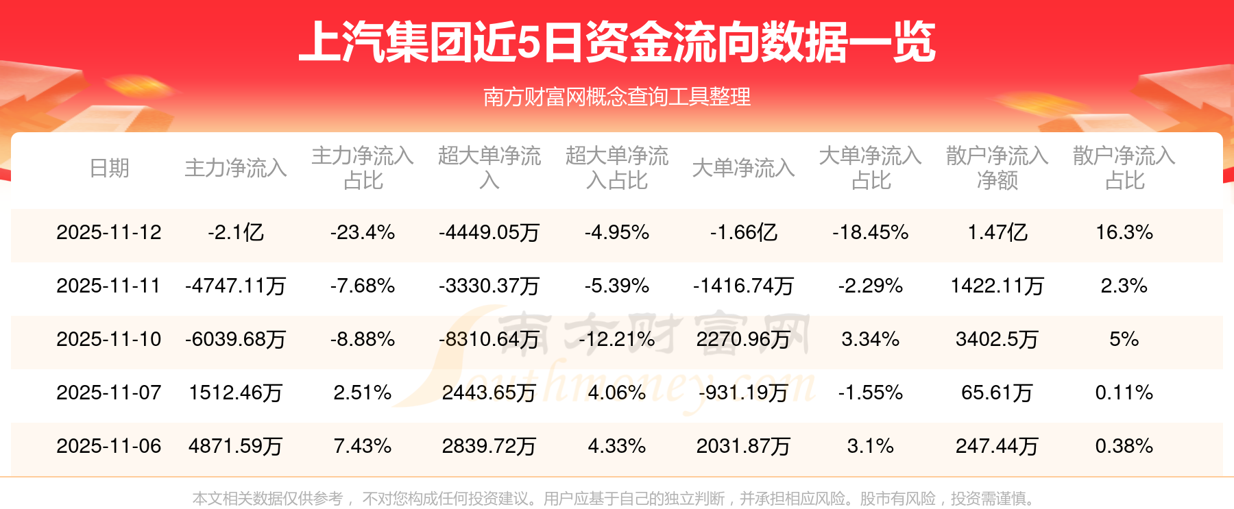 11月12日消息,上汽集團(tuán)11月12日主力凈流出2.1億元,超大單凈流出4449.05萬元,大單凈流出1.66億元,散戶凈流入1.47億元。