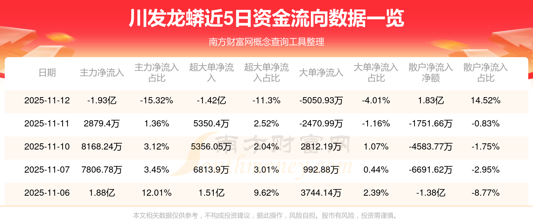 11月12日消息,川發(fā)龍蟒11月12日主力資金凈流出1.93億元,超大單資金凈流出1.42億元,大單資金凈流出5050.93萬元,散戶資金凈流入1.83億元。