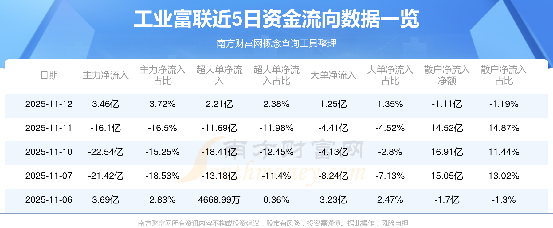 資金流向數(shù)據(jù)方面,11月12日主力資金凈流流入3.46億元,超大單資金凈流入2.21億元,大單資金凈流入1.25億元,散戶資金凈流出1.11億元。
