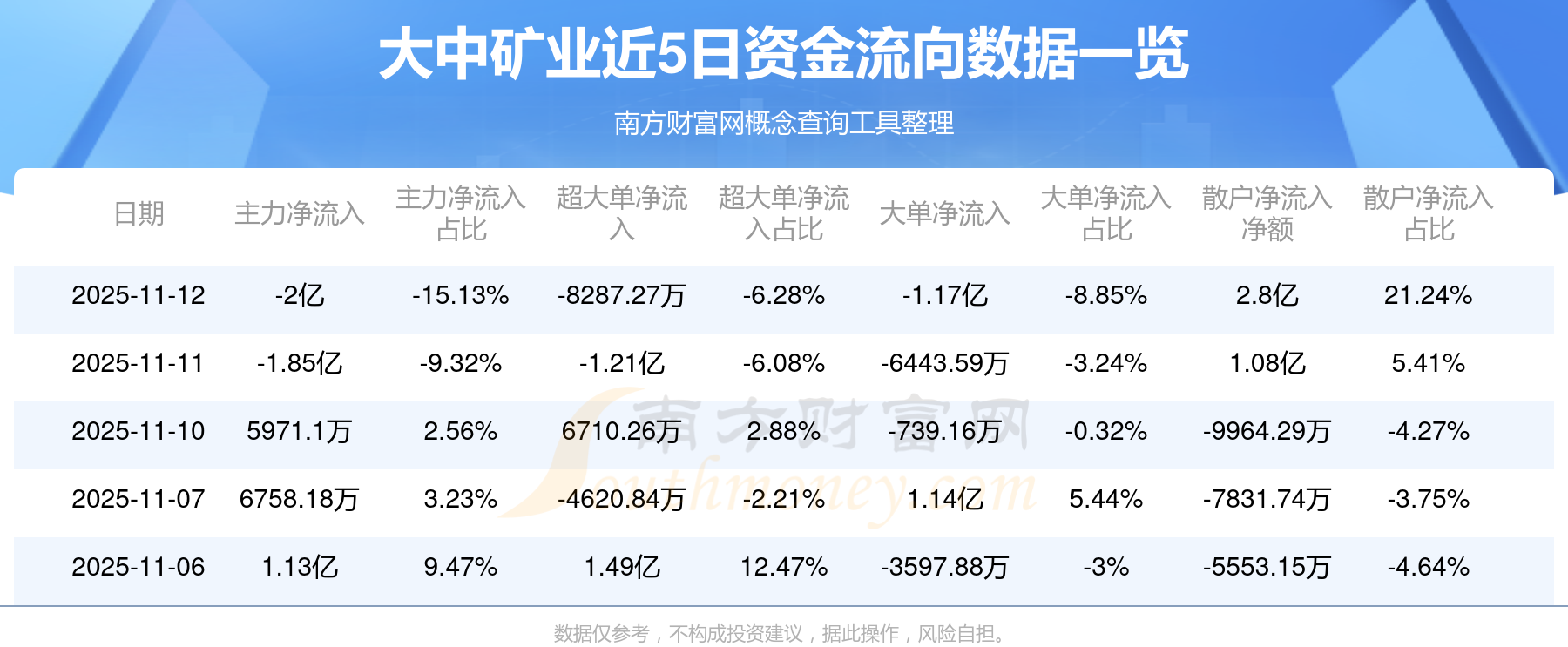 11月12日消息,大中礦業(yè)資金凈流出2億元,超大單資金凈流出8287.27萬元,換手率3%,成交金額9.67億元。