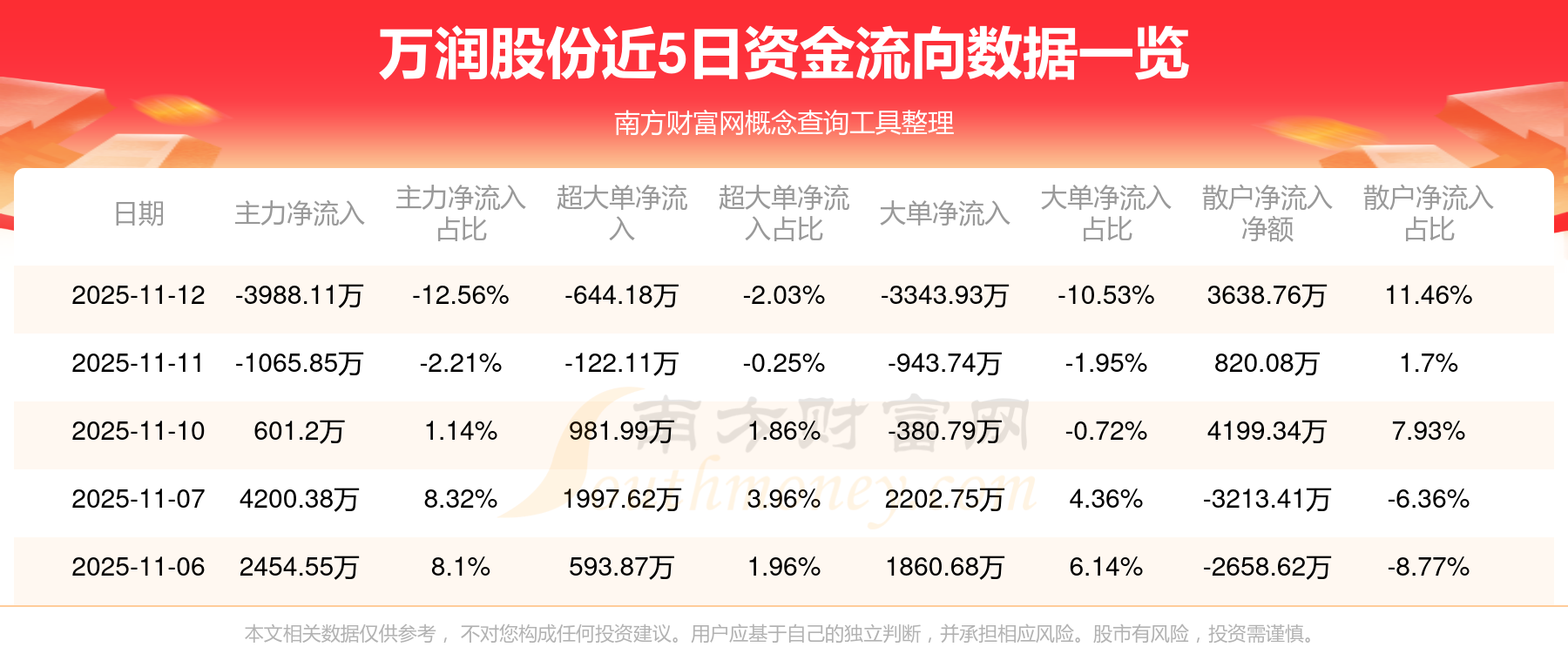 11月12日消息,萬潤股份資金凈流出3988.11萬元,超大單凈流出644.18萬元,換手率5.06%,成交金額6.65億元。