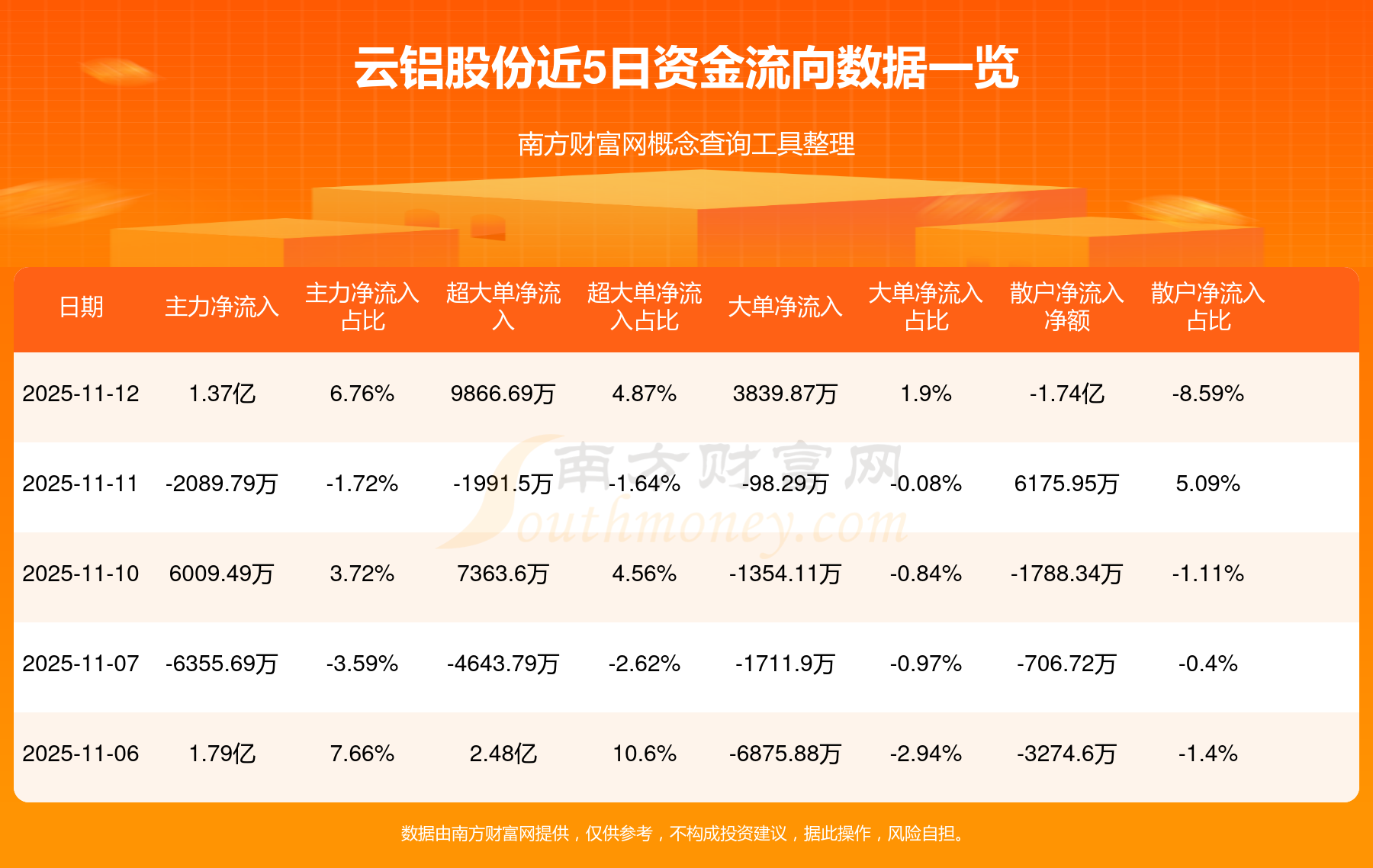 11月12日消息,云鋁股份11月12日主力凈流入1.37億元,超大單凈流入9866.69萬元,大單凈流入3839.87萬元,散戶凈流出1.74億元。