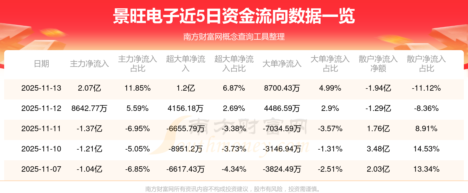 11月13日消息,景旺電子資金凈流入2.07億元,超大單資金凈流入1.2億元,換手率2.64%,成交金額17.44億元。