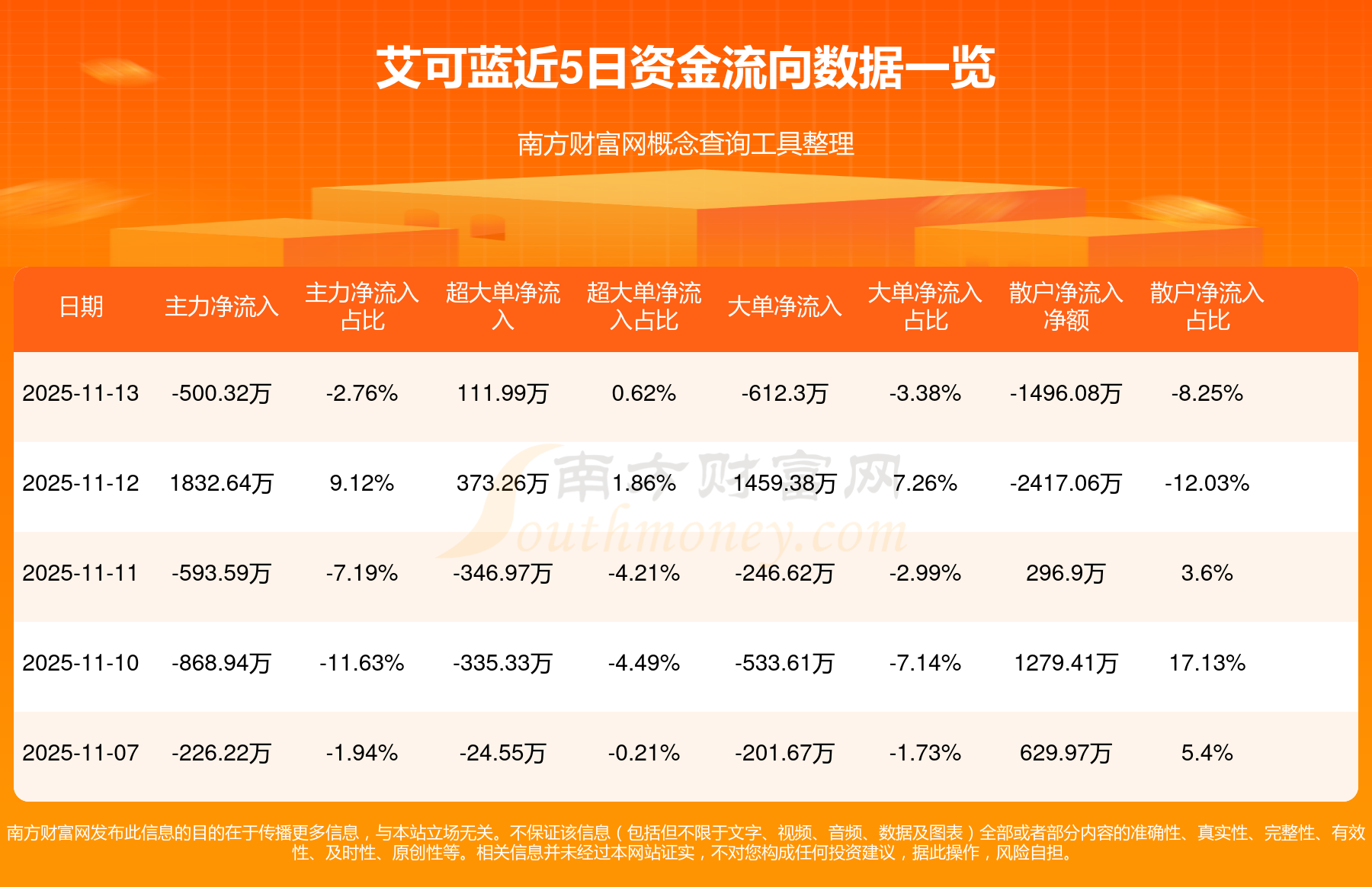 11月13日消息,艾可藍(lán)主力凈流出500.32萬元,超大單凈流入111.99萬元,散戶凈流出1496.08萬元。