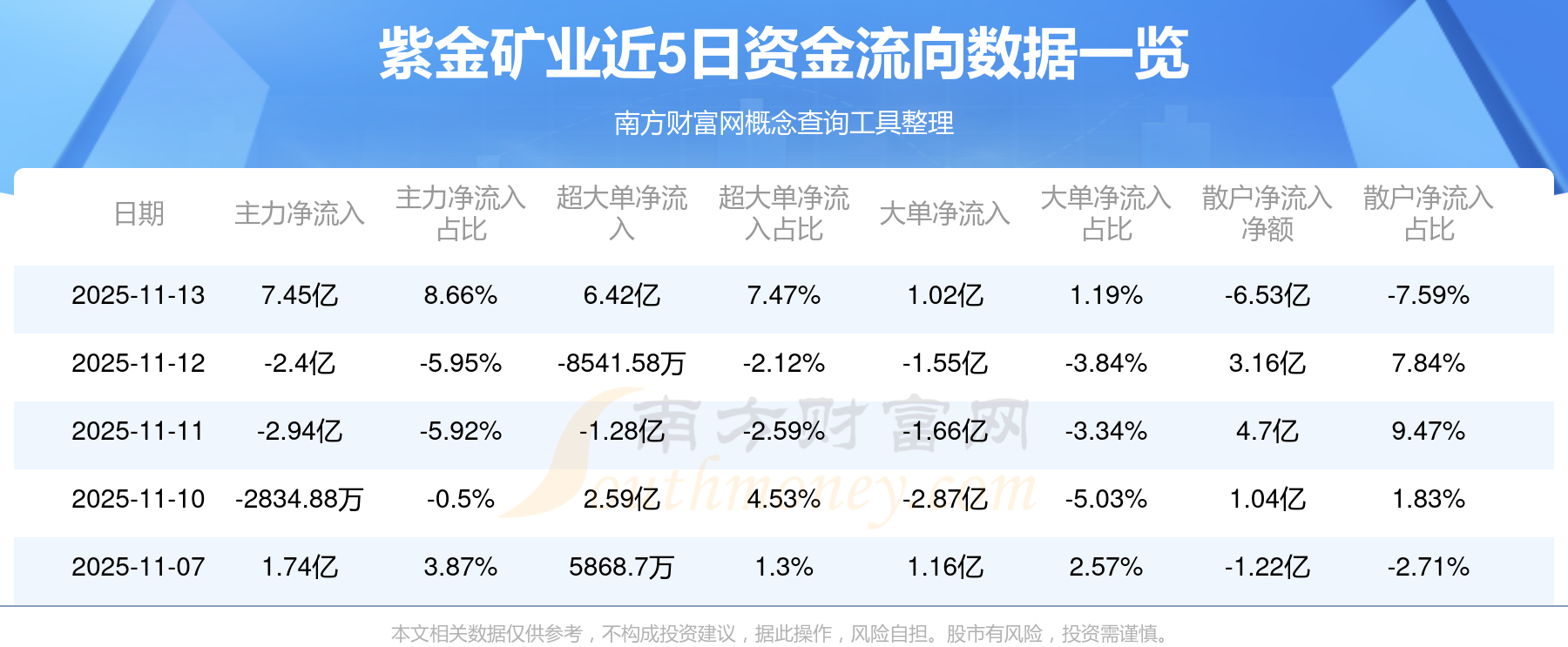 11月13日消息,紫金礦業(yè)資金凈流入7.45億元,超大單凈流入6.42億元,換手率1.36%,成交金額85.98億元。