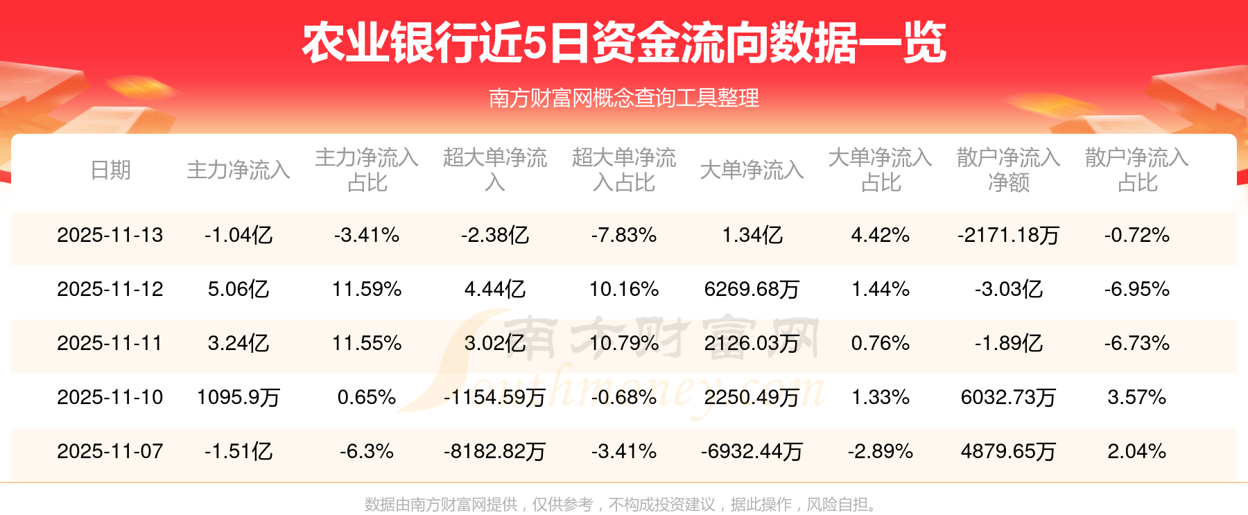 11月13日消息,農(nóng)業(yè)銀行資金凈流出1.04億元,超大單凈流出2.38億元,換手率0.11%,成交金額30.34億元。