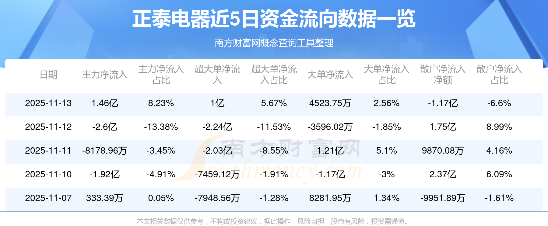 11月13日消息,正泰電器11月13日主力資金凈流入1.46億元,超大單資金凈流入1億元,大單資金凈流入4523.75萬元,散戶資金凈流出1.17億元。