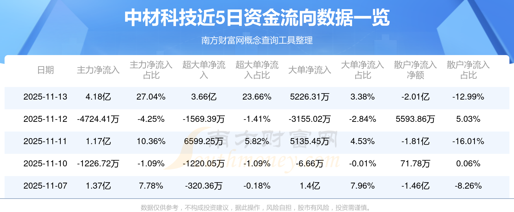 11月13日消息,中材科技11月13日主力凈流入4.18億元,超大單凈流入3.66億元,大單凈流入5226.31萬元,散戶凈流出2.01億元。