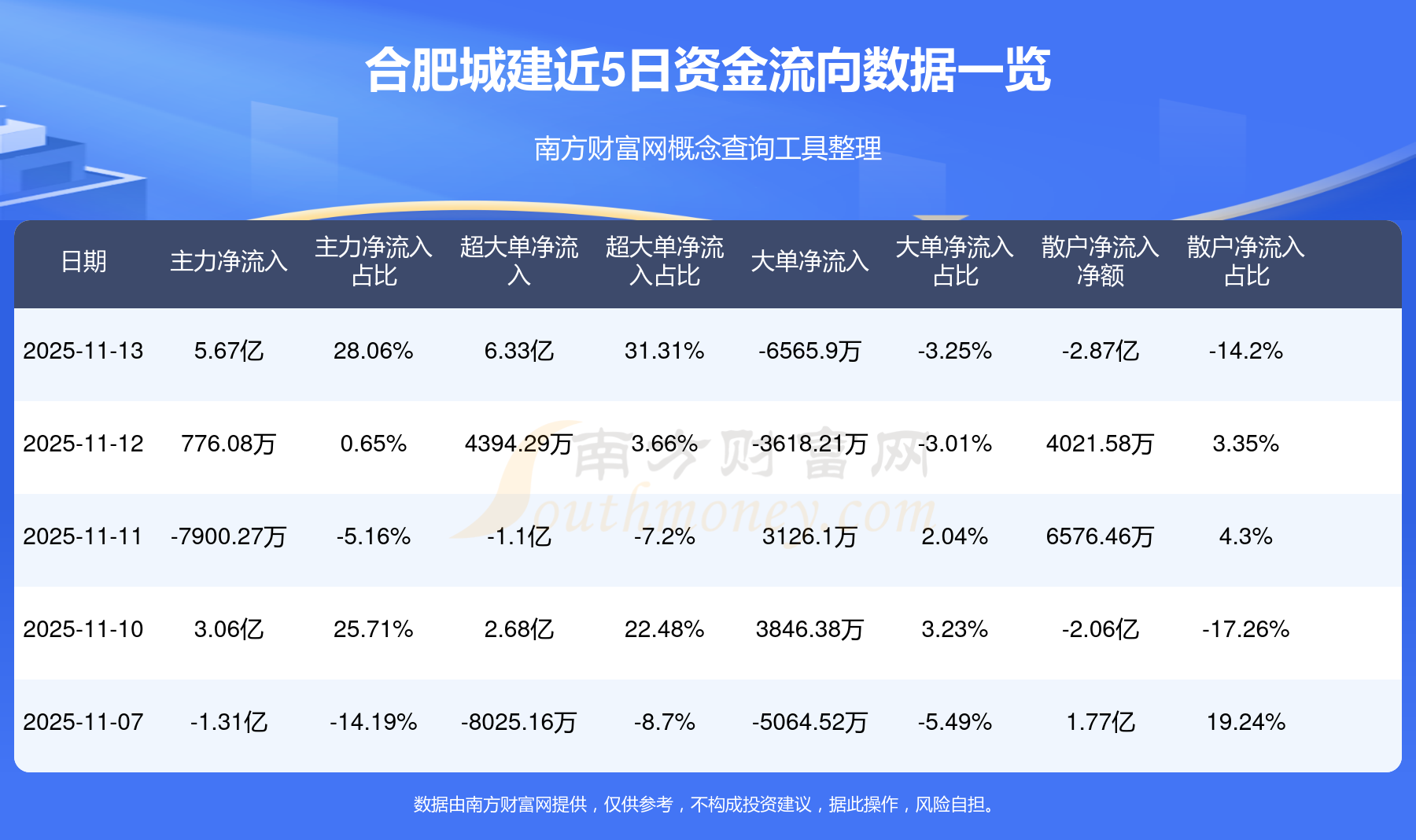11月13日消息,合肥城建11月13日主力資金凈流入5.67億元,超大單資金凈流入6.33億元,大單資金凈流出6565.9萬元,散戶資金凈流出2.87億元。