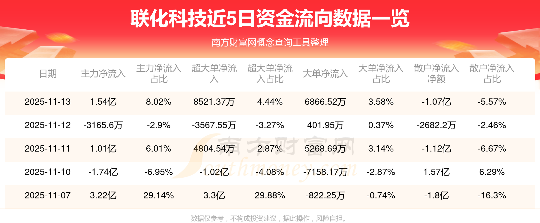 11月13日消息,聯(lián)化科技資金凈流入1.54億元,超大單資金凈流入8521.37萬元,換手率15.47%,成交金額19.19億元。
