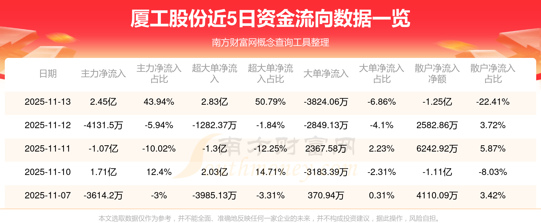11月13日該股主力凈流入2.45億元,超大單凈流入2.83億元,大單凈流出3824.06萬元,中單凈流出1.2億元,散戶凈流出1.25億元。