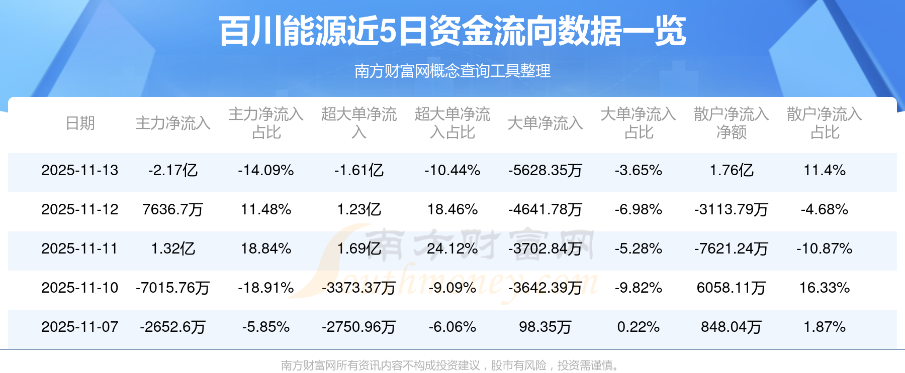 11月13日消息,百川能源主力資金凈流出2.17億元,超大單資金凈流出1.61億元,散戶資金凈流入1.76億元。