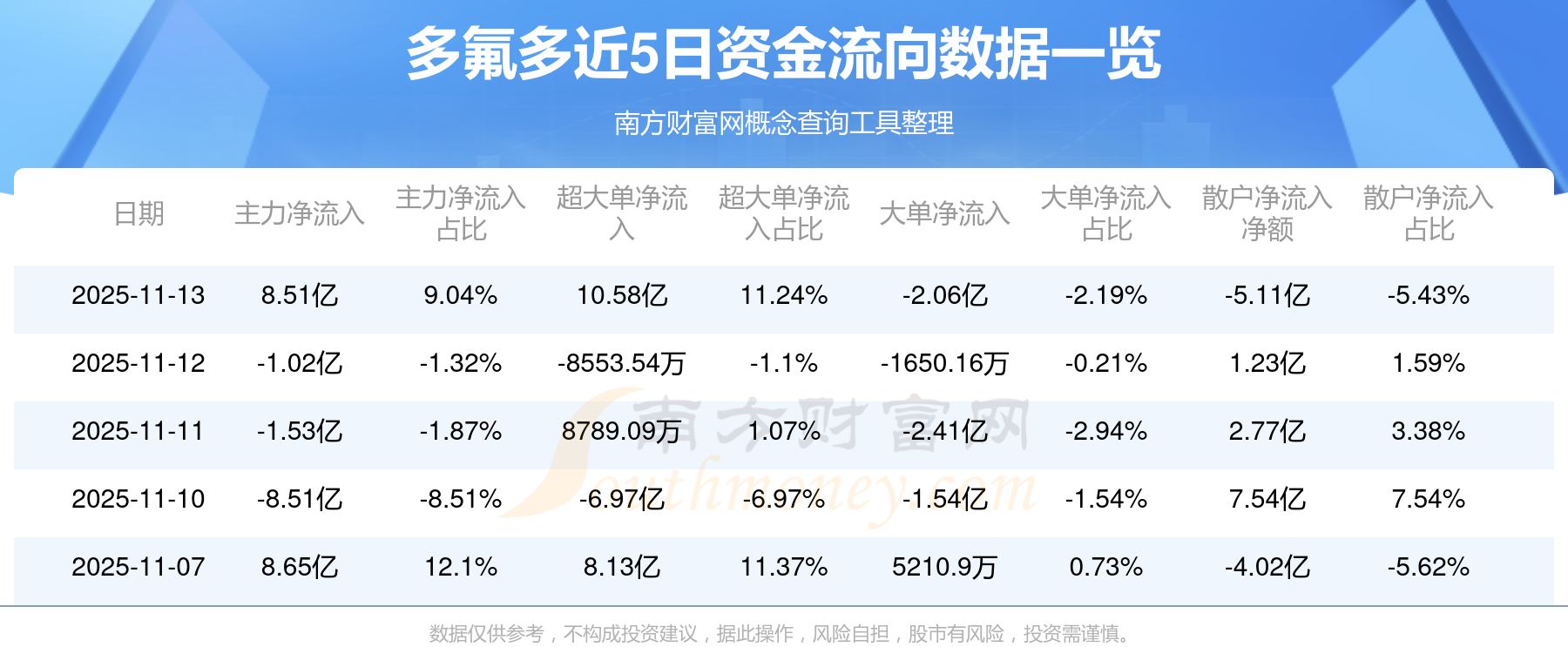 11月13日消息,多氟多資金凈流入8.51億元,超大單資金凈流入10.58億元,換手率23.9%,成交金額94.14億元。