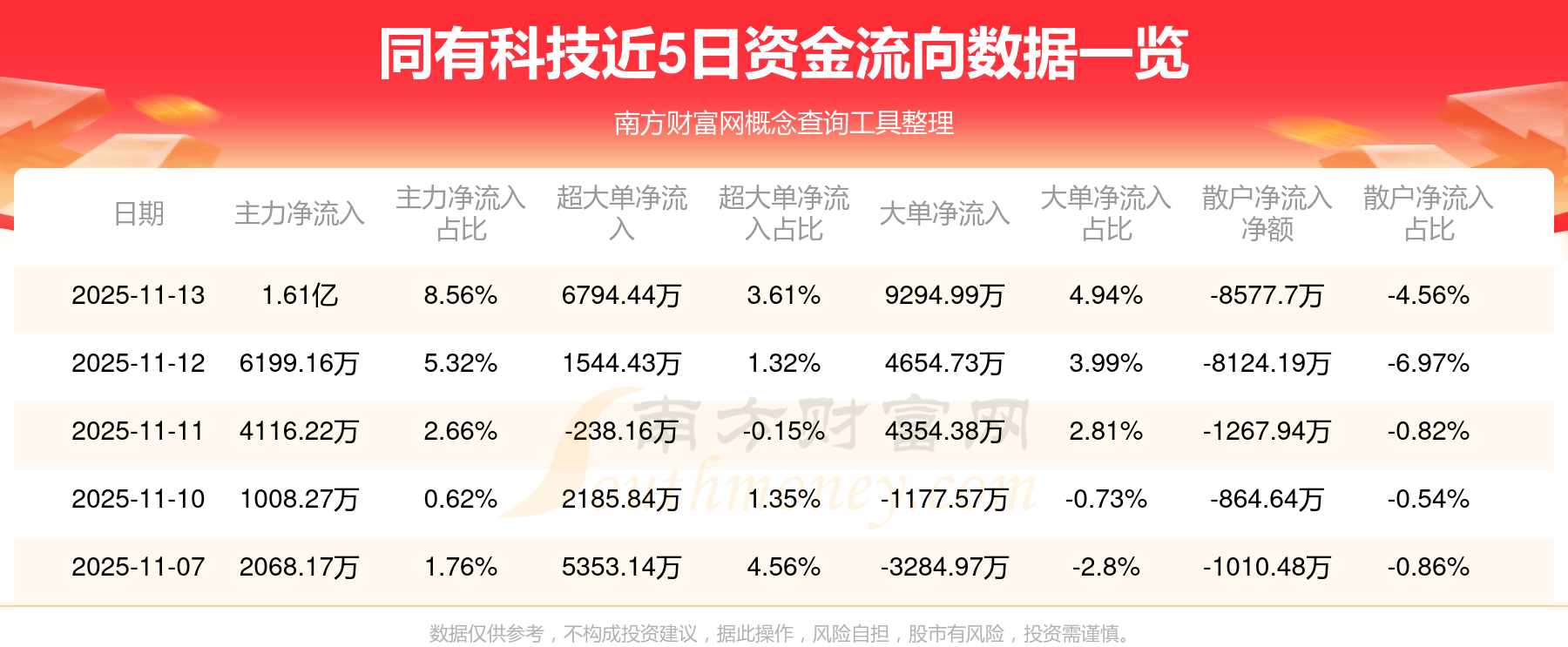 11月13日消息,同有科技主力資金凈流入1.61億元,超大單資金凈流入6794.44萬元,散戶資金凈流出8577.7萬元。