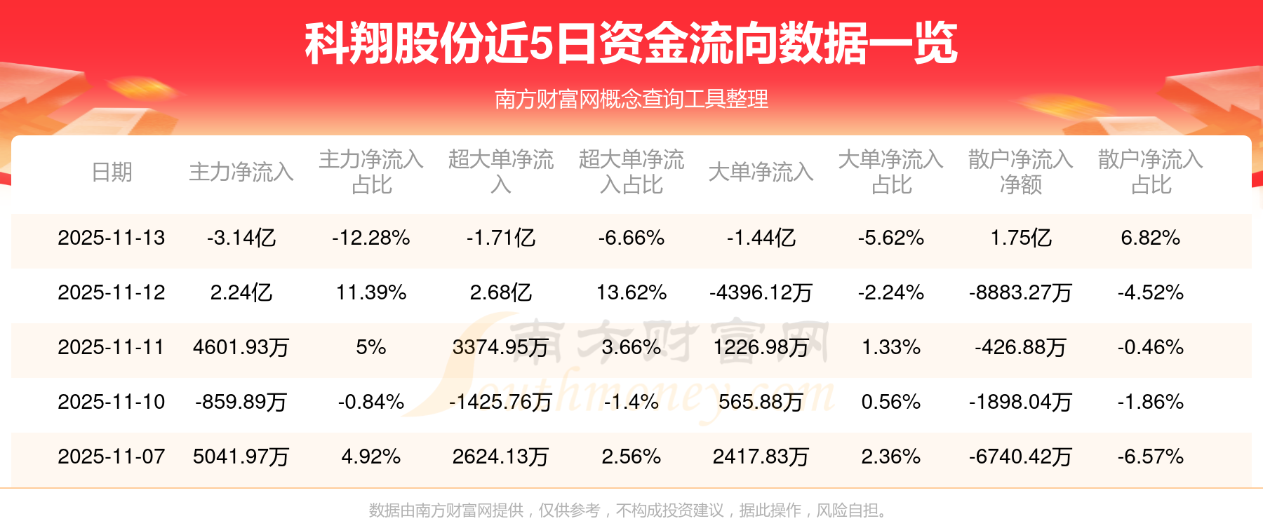 11月13日消息,科翔股份資金凈流出3.14億元,超大單資金凈流出1.71億元,換手率35.5%,成交金額25.59億元。