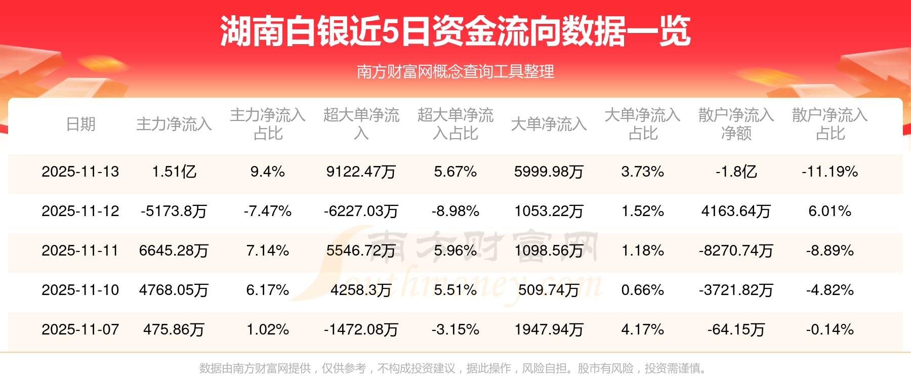 11月13日消息,湖南白銀資金凈流入1.51億元,超大單資金凈流入9122.47萬元,換手率10.3%,成交金額16.09億元。