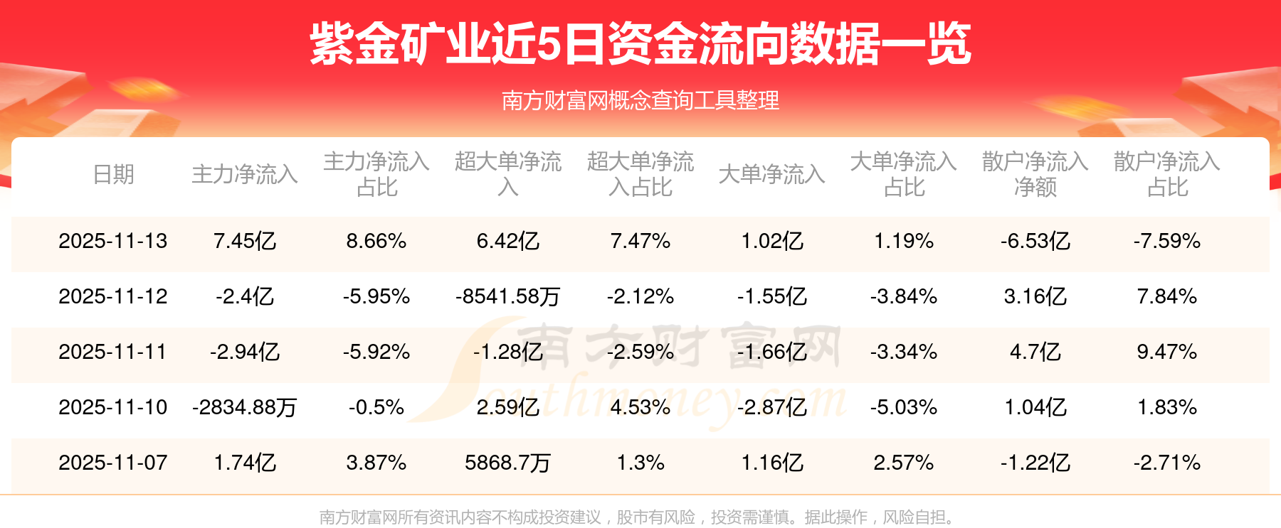 11月13日消息,紫金礦業(yè)11月13日主力凈流入7.45億元,超大單凈流入6.42億元,大單凈流入1.02億元,散戶凈流出6.53億元。