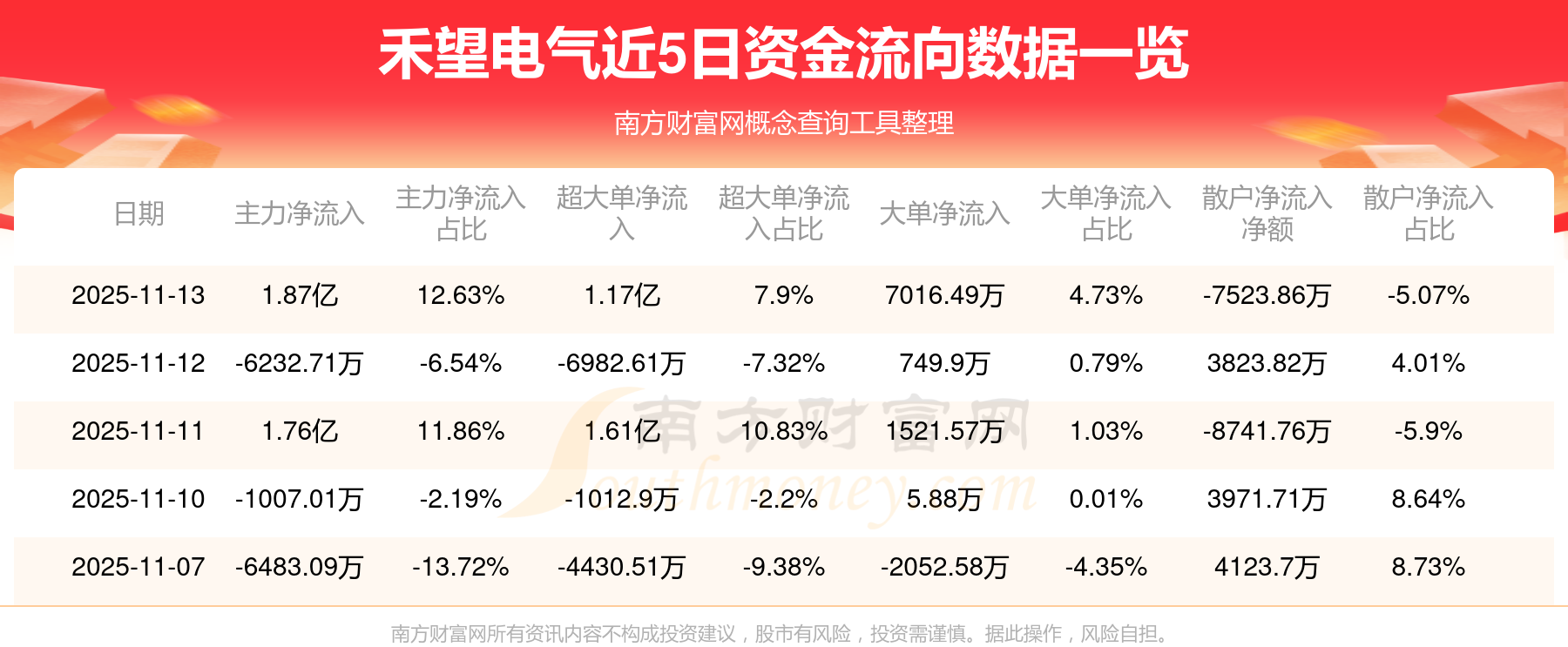 11月13日消息,禾望電氣主力資金凈流入1.87億元,超大單資金凈流入1.17億元,散戶資金凈流出7523.86萬元。