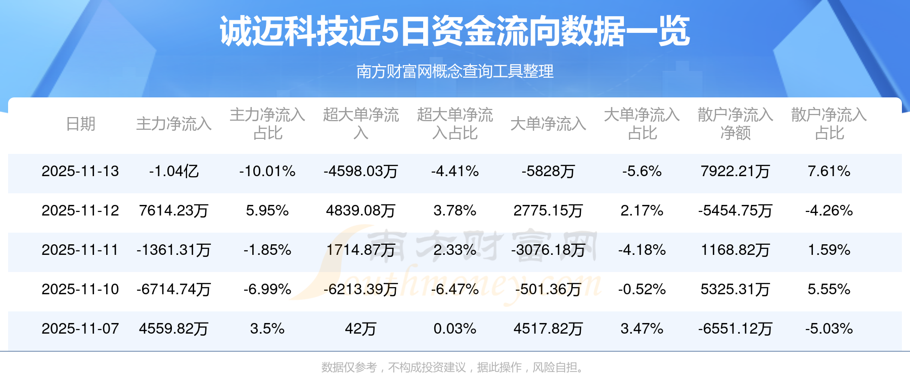 11月13日消息,誠邁科技主力資金凈流出1.04億元,超大單資金凈流出4598.03萬元,散戶資金凈流入7922.21萬元。