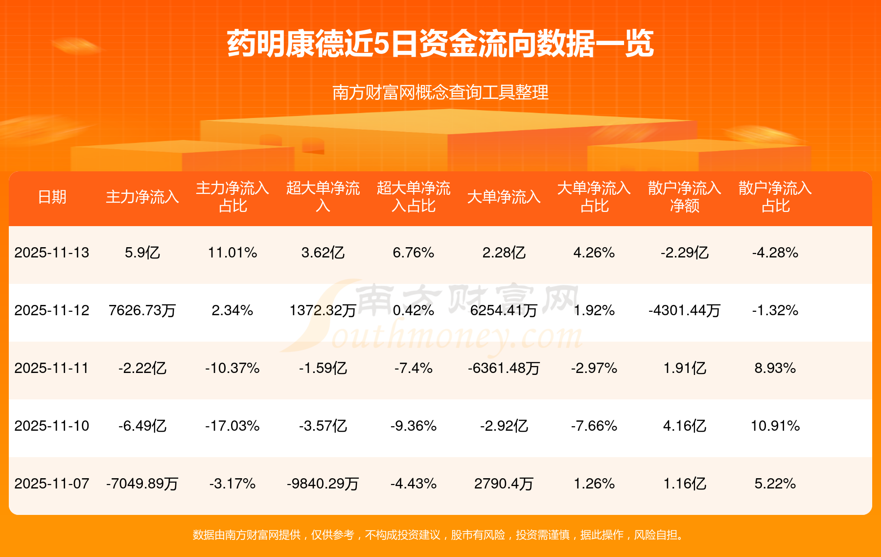 11月13日消息,藥明康德11月13日主力凈流入5.9億元,超大單凈流入3.62億元,大單凈流入2.28億元,散戶凈流出2.29億元。