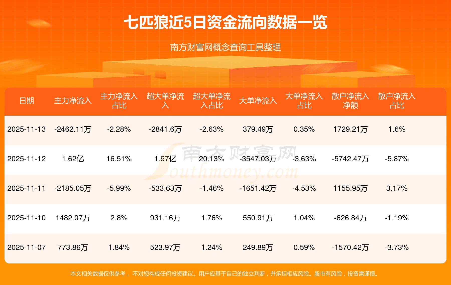 11月13日消息,七匹狼主力資金凈流出2462.11萬元,超大單資金凈流出2841.6萬元,散戶資金凈流入1729.21萬元。