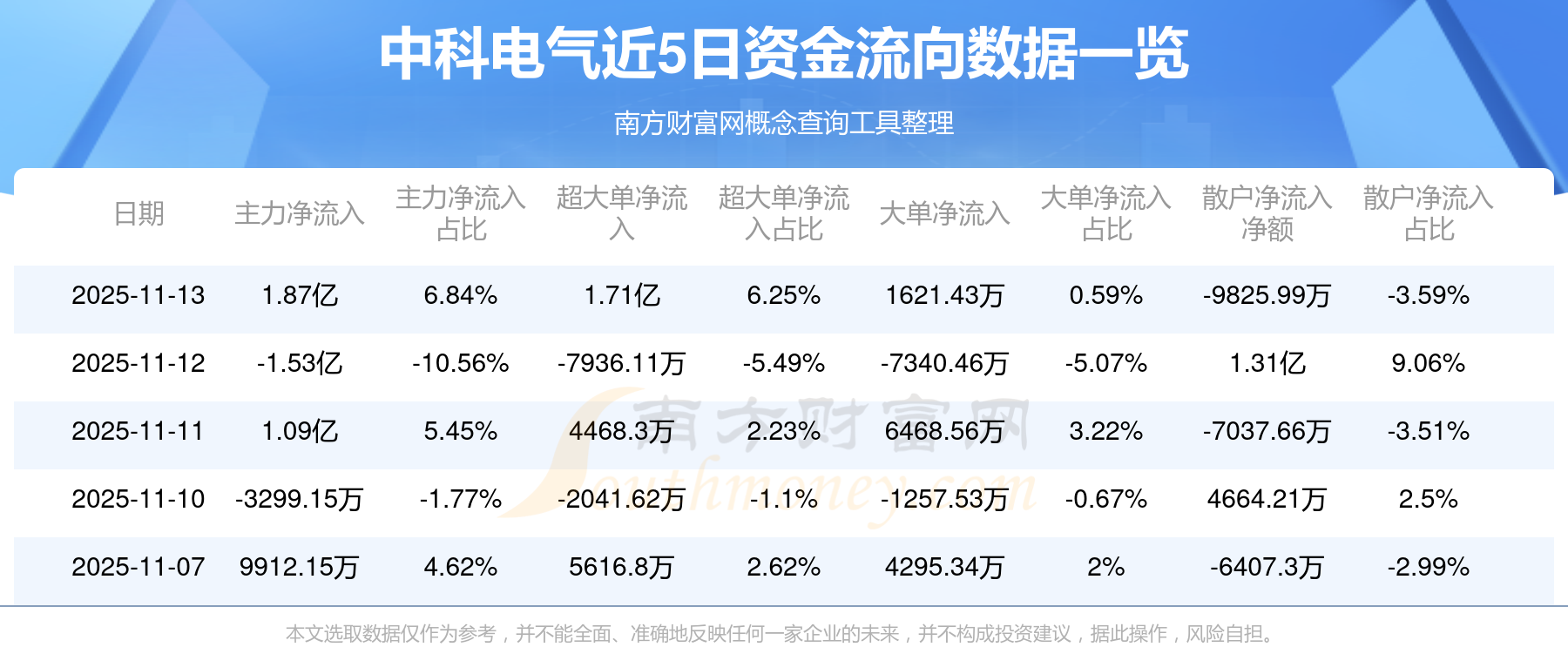 11月13日消息,中科電氣主力凈流入1.87億元,超大單凈流入1.71億元,散戶凈流出9825.99萬元。