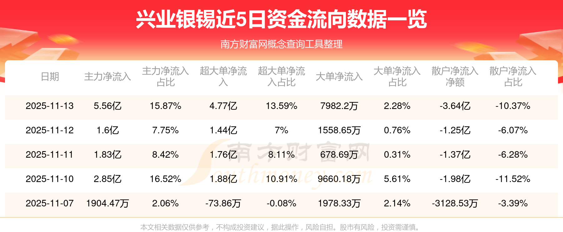11月13日消息,興業(yè)銀錫主力凈流入5.56億元,超大單凈流入4.77億元,散戶凈流出3.64億元。