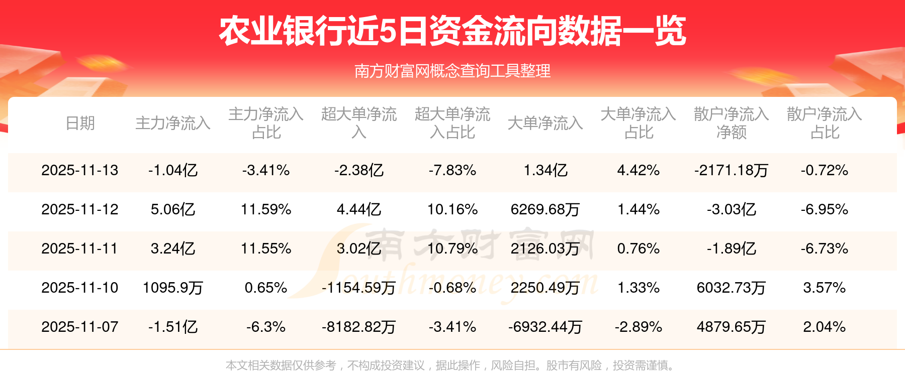 11月13日消息,農(nóng)業(yè)銀行11月13日主力資金凈流出1.04億元,超大單資金凈流出2.38億元,大單資金凈流入1.34億元,散戶資金凈流出2171.18萬元。