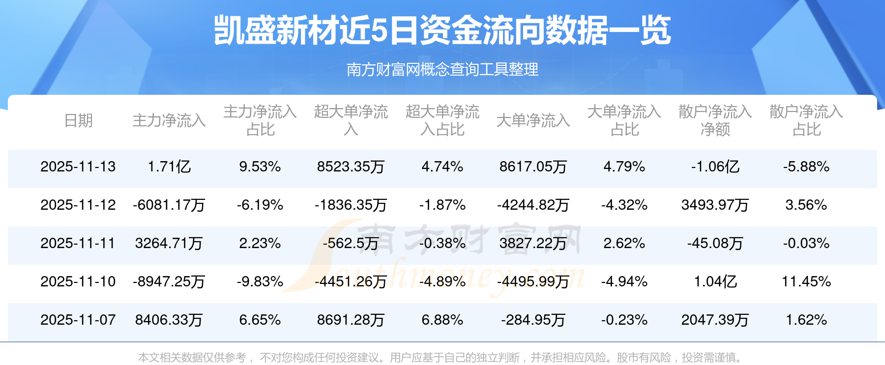 11月13日消息,凱盛新材11月13日主力凈流入1.71億元,超大單凈流入8523.35萬(wàn)元,大單凈流入8617.05萬(wàn)元,散戶凈流出1.06億元。