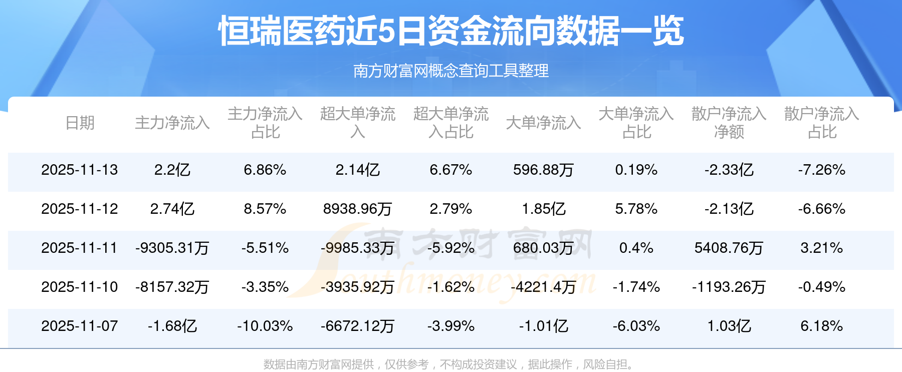 11月13日消息,恒瑞醫(yī)藥11月13日主力凈流入2.2億元,超大單凈流入2.14億元,大單凈流入596.88萬元,散戶凈流出2.33億元。