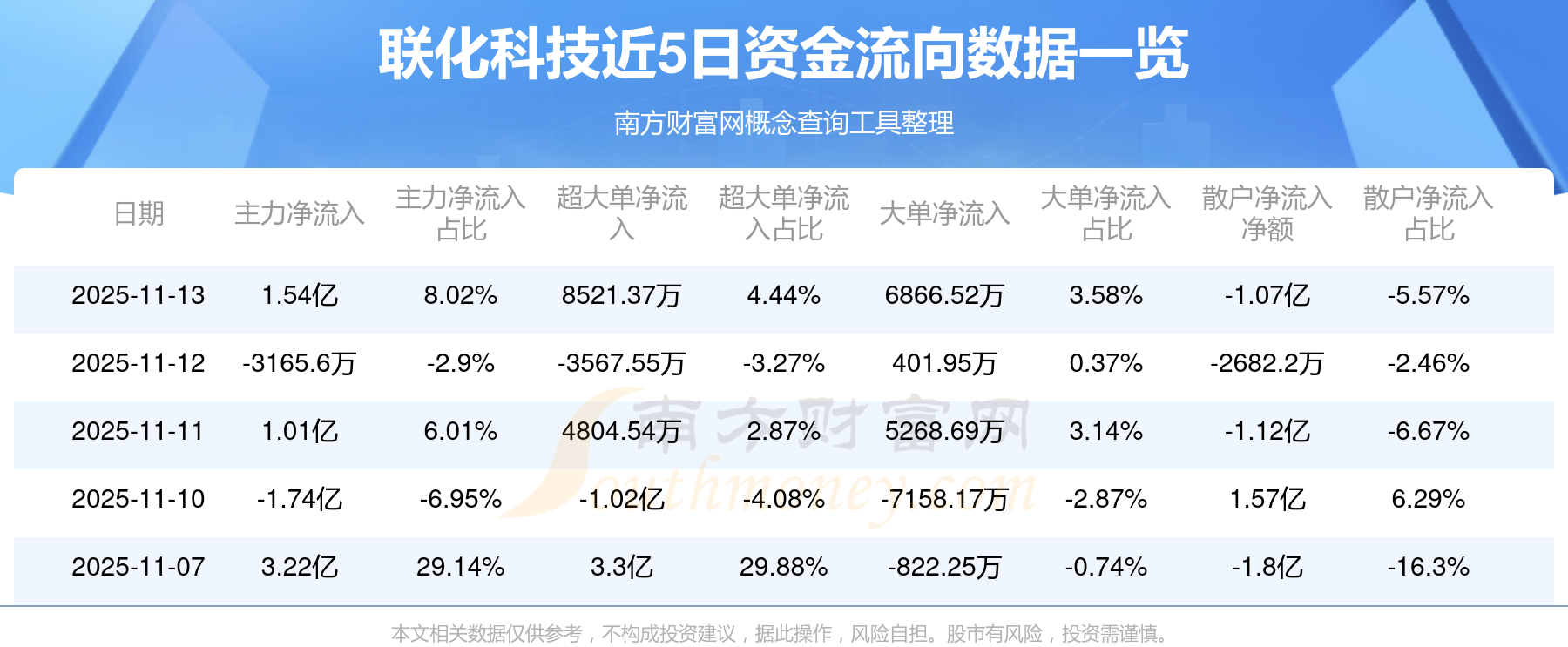 11月13日消息,聯(lián)化科技主力凈流入1.54億元,超大單凈流入8521.37萬元,散戶凈流出1.07億元。