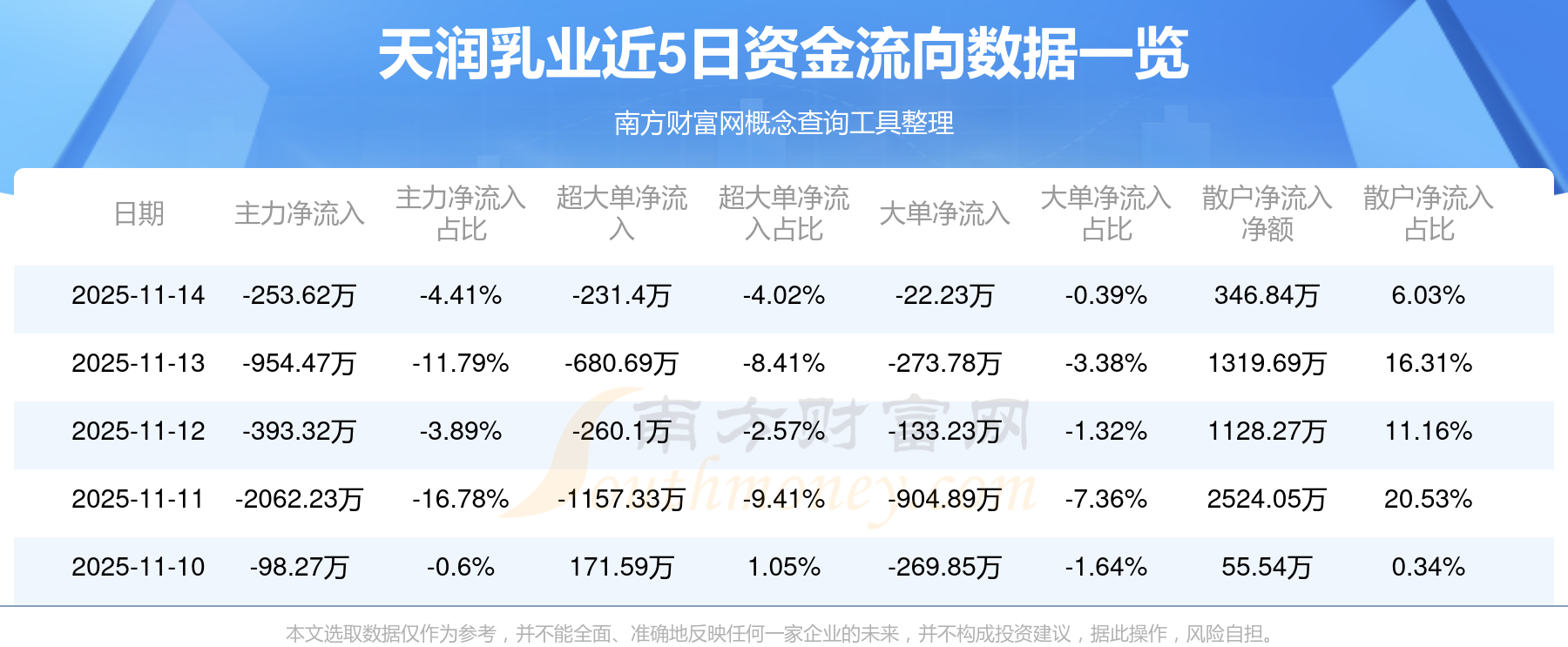 11月14日消息,天潤乳業(yè)11月14日主力資金凈流出253.62萬元,超大單資金凈流出231.4萬元,大單資金凈流出22.23萬元,散戶資金凈流入346.84萬元。